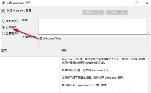 5. 最后在“关闭Windows日历”的弹框中先点击“已启用”选项,再点击确定选项即可,如下图所示。
