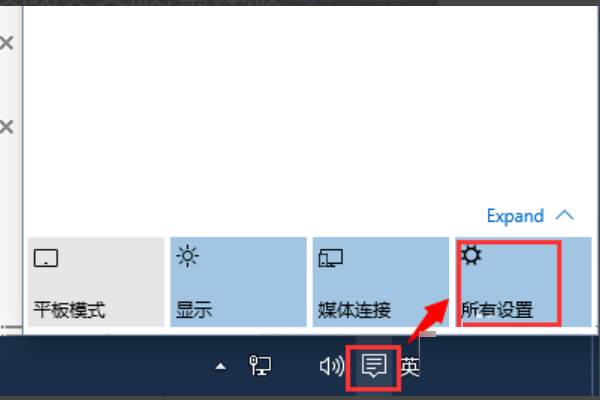 1、首先,在任务栏右下方的通知图标处点击一次,随后在弹出的通知栏中选择并进入全部设置选项,如下图所示。