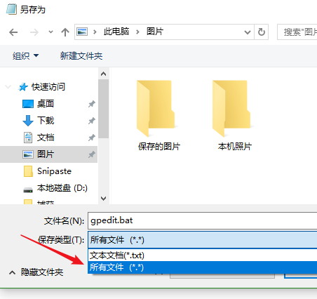 4、在弹出的界面中选择保存路径、文件名(这里命名为gpedit.bat),注意文件类型为“所有文件”,只有这样才能保证gpedit.bat是一个批处理文件,如下图所示。