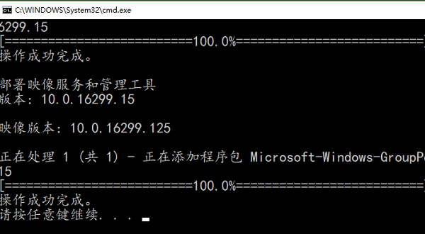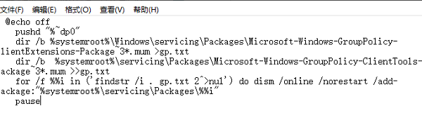 说明:通过dir命令遍历系统盘servicing目录,寻找组策略的配置包,找到后写入到gp.txt文件,然后通过dism命令来安装组策略包。