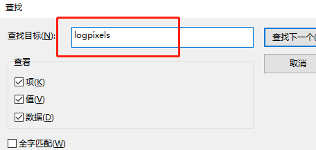 4、按下“Ctrl+F”输入“logpixels”,然后打开,想放大到120%,就填写78:78(120%),7D(125%),96(150%),C8(200%),如下图所示。