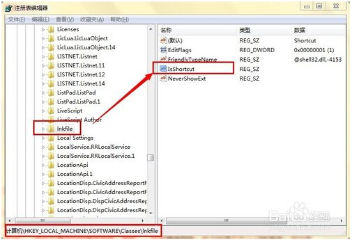 2、依次展开“Hkey_CLASSES_ROOTlnkfile”删除“lnkfile”子项中的“IsShortcut”字符串值项。“IsShortcut”项就是用来控制是否显示普通应用程序和数据文件快捷方式中小箭头的;