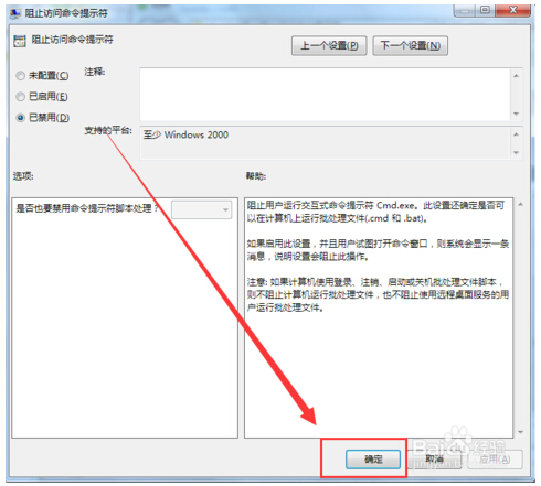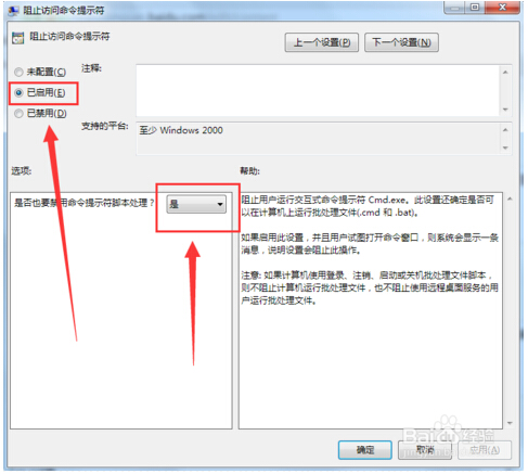5、然后在打开的窗口,单击选中【已启用】这个选项,并且将下方的【是否也禁用命令提示符脚本处理】选择【是】,如下图所示。