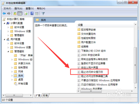 4、然后在窗口的右侧找到【阻止访问命令提示符】这个选项,并且双击将它打开,如下图所示。