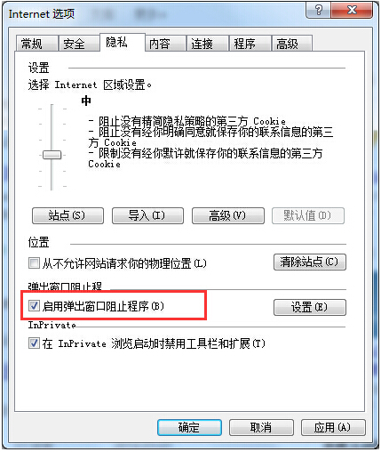 2、在“Internet选项”窗口中,选择“隐私”标签,勾选“打开弹出窗口阻止程序”就可以啦!