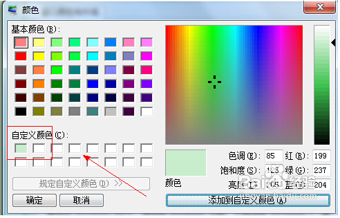 5、在颜色中将色调调整为85;饱和度调整为125,亮度调整为205,点击添加到自定义颜色中。