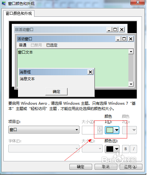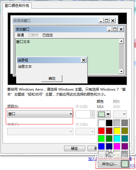 4、在弹出的窗口颜色和外观中,将项目选为“窗口”颜色选为其他,进入到颜色选择。