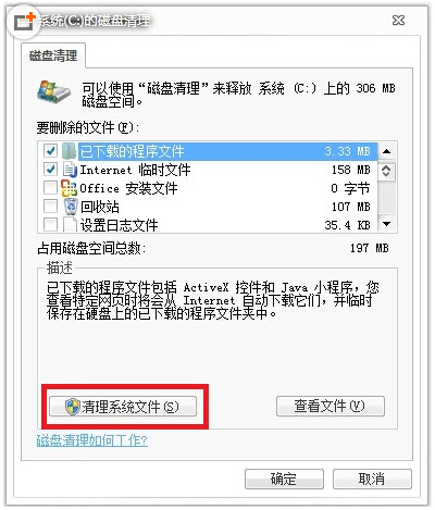 4.上面窗口结束后会出现C盘的“清理清单”,在此窗口我们选择“清理系统文件”项