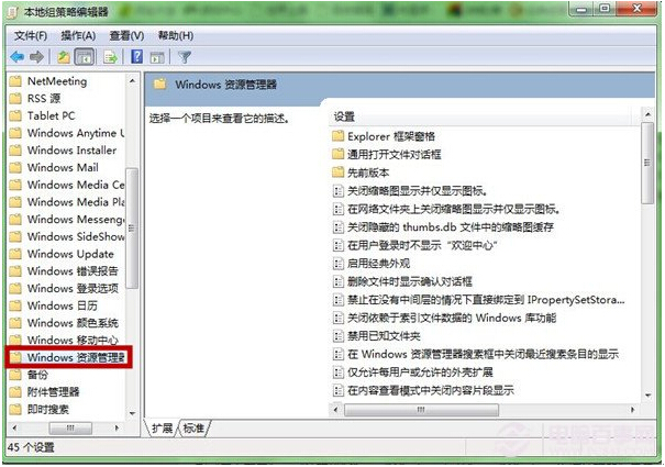 第二步、在“本地组策略编辑器”窗口左侧,依次找到“用户配置”-“管理模版”-“Windows组件”-“Windows资源管理器”。