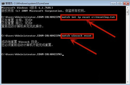2.进入以后在里面依次输入“netsh int ip reset c:/resetlog.txt ”后按回车,然后继续输入“netsh winsock reset ”后按回车,之后重启电脑即可(如图所示)。