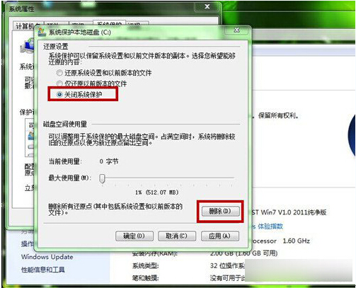 第四步、在弹出的“系统保护本地磁盘”窗口中,我们把“还原设置”改为“关闭系统保护”,再单击“删除”。