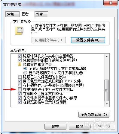进入文件夹选项后,点击“查看”选项,然后找到“在单独的进程中打开文件夹窗口”,出现上面问题的原因就是这个选项前面打了勾,因此我们将前面的勾去掉就好了。