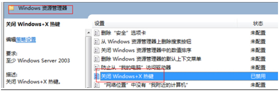 第五步——后退到用户配置——管理模板——windows组件——windows资源管理器,在里面找到【关闭windows+x热键】,按上面说的双击禁用或者未配置。