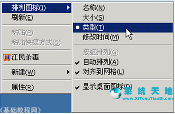 2)然后在列表中选定“类型”,如此,这些桌面程序图标便会遵照文件类别去排列,若是点“名称”排列,是用数字或是字母顺序来排列的,之后将列表中的“自动排列”勾选上,如此便会新建文件了,图标也能自动排列工整了;