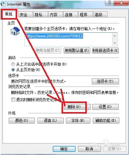 3、在打开的“Internet属性”对话框,切换到“常规”选项卡,单击下面的“删除”按钮。