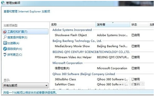2、在打开的对话框列表中,禁用一些可疑的程序和插件。