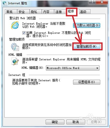 1、在浏览器上面单击菜单栏“工具”——Internet选项,打开“Internet属性”对话框,切换到“程序”选项卡,单击下面的“管理加载项”按钮。