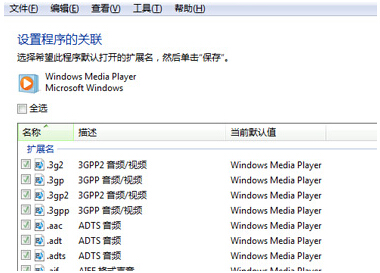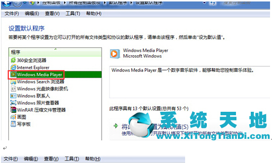 3.用户在左侧窗口里面直接选中Windows Media Player软件,紧跟着大家在右侧窗口里面直接鼠标单击“将此程序设置为默认值”,这时候系统便会弹出下面的设置程序的关联的窗口了,大家只要选择其中我们需要修改后缀的影音文件,并且点击保存按钮就行了。