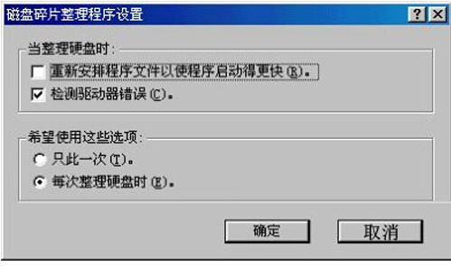 2.单击“设置”按钮,系统弹出磁盘碎片整理程序设置对话框如图,清除“重新安排程序文件以使程序启动得更快”复选框。清除该选项后,磁盘碎片整理程序将按一个连续单元排放所有文件,且不对程序进行优化。这虽加快了整理的速度,但无法保证最快速启动常用程序。单击“确定”按钮。