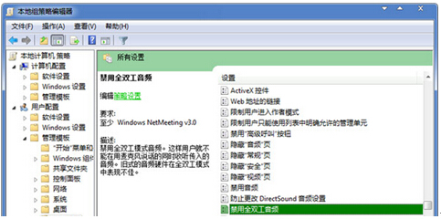 2、在本地组策略编辑器中,依次展开“用户配置——管理模板——所有设置”,在右侧窗格中找到并双击“禁用全双工音频”的选项