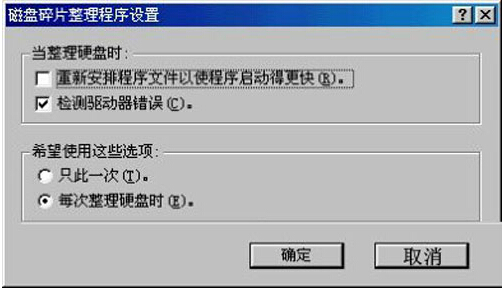 2.单击“设置”按钮,系统弹出磁盘碎片整理程序设置对话框如图,清除“重新安排程序文件以使程序启动得更快”复选框。清除该选项后,磁盘碎片整理程序将按一个连续单元排放所有文件,且不对程序进行优化。这虽加快了整理的速度,但无法保证最快速启动常用程序。单击“确定”按钮。