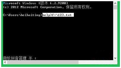 第二步、在出现的命令提示符窗口,输入“help>f:123.txt”后回车;