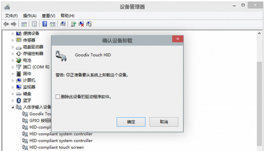 使用有线键鼠进入系统,在“设备管理器”中点击“人体学输入设备”项,右键单击Goodix Touch HID项,选择菜单中的“卸载”,接着在打开的“确认设备卸载”对话框中,取消对“删除此设备的驱动程序软件”项的勾选,单击“确定”按钮(图5)。