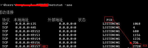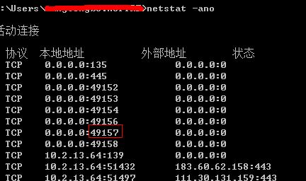 2、在命令提示符中输入:netstat -ano 按下回车键即可看到所有的端口占用情况,比如是49157,我们在下面找到它;