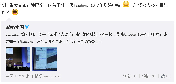 可以看出,在Windows 10中微软小娜主要是办公助手,而微软小冰则是扮演可爱轻松的角色。由于Windows 10的跨平台性,微软小娜与微软小冰均可出现在搭载windows10的PC和移动产品中。
