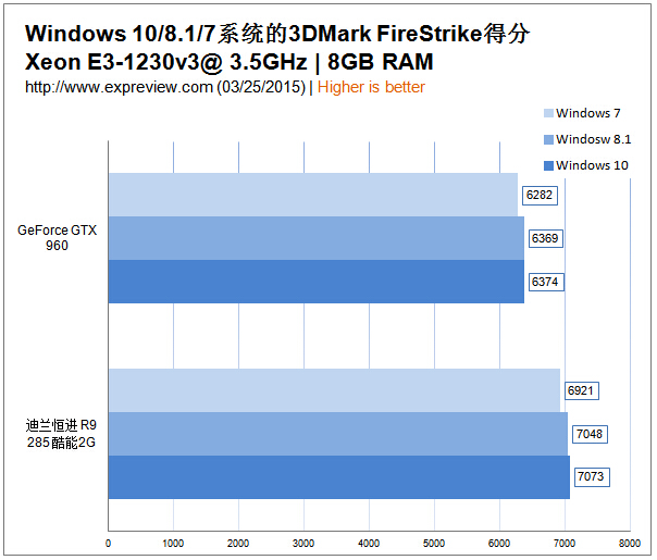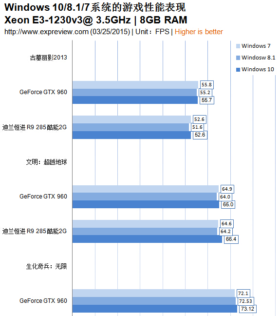 今天我们就来看看Windows 10、Windows 8.1与Windows 7系统会对游戏性能有怎么样的影响,驱动版本都更新到各自最新的,测试平台使用Xeon E3-1230 v3处理器,双通道8GB内存,显卡则会分别拿GeForce GTX 960和Radeom R9 285来测试,看看N卡与A卡在三个不同系统下会有怎么样的差别。