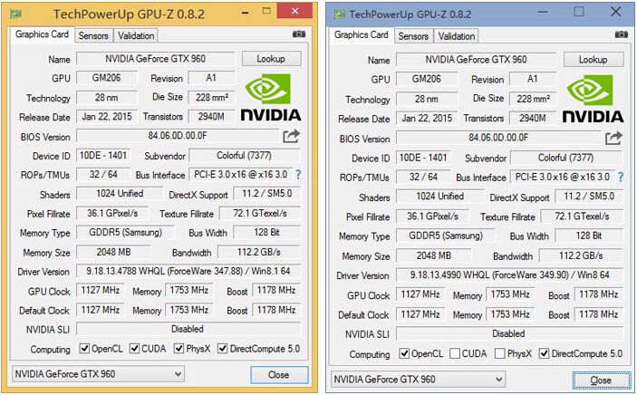 Windows 7/8.1系统所用的最新NVIDIA显卡驱动版本是347.88(左图),而Windows 10系统现在最新的驱动版本号是349.90(右图)。