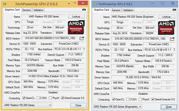 AMD显卡在Windows 7/8.1系统上最新的驱动版本是Catalyst 15.3,版本号是14.502.1014.0(左图),而Windows 10系统上的驱动版本号是15.200.1012.2(右图)。