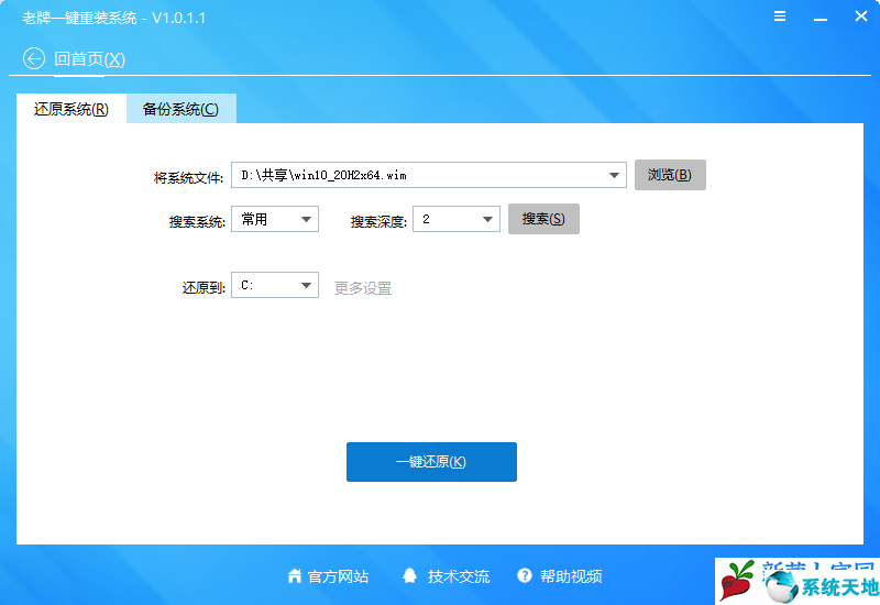 第三步:选择还原镜像,镜像指的是我们下载的ISO文件解压里面的wim格式镜像文件,也有esd格式,gho格式。点击一键还原即可