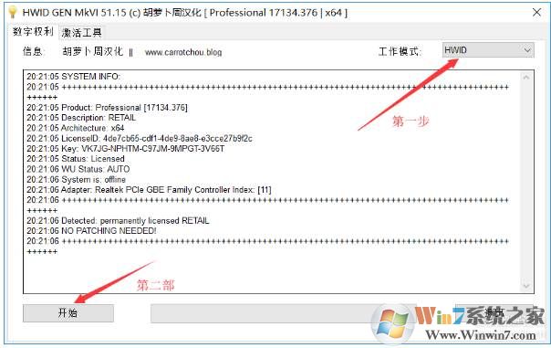 2、如下方图示,点击工作模式为HWID,然后点击开始按钮。(需要联网)